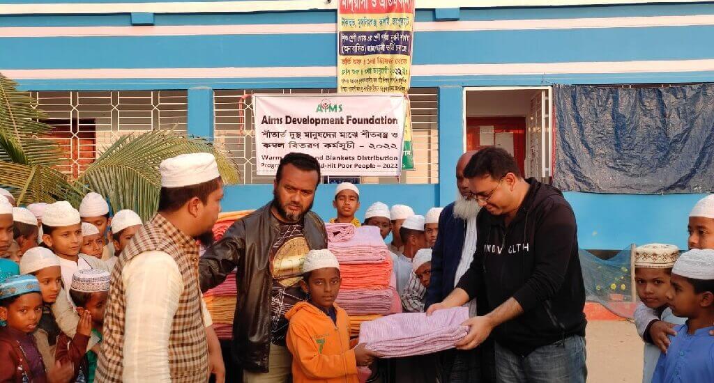 Today, on 21.01.2022, under the initiative of Aims Development Foundation, warm clothes and 100 blankets are delivered to the Al Hera Adhunik Nurani Hafezia Madrasa O Atimkhana for 100 cold-hit orphan students of Takahut area under Kalai police station in Joypurhat district of Bangladesh. In that ceremony of distributing warm clothes and blankets, the founder, chairman, directors and members of Aims Development Foundation and some honorable persons of that area were present. ADF own and several people of that area worked as volunteers to make the function successful.